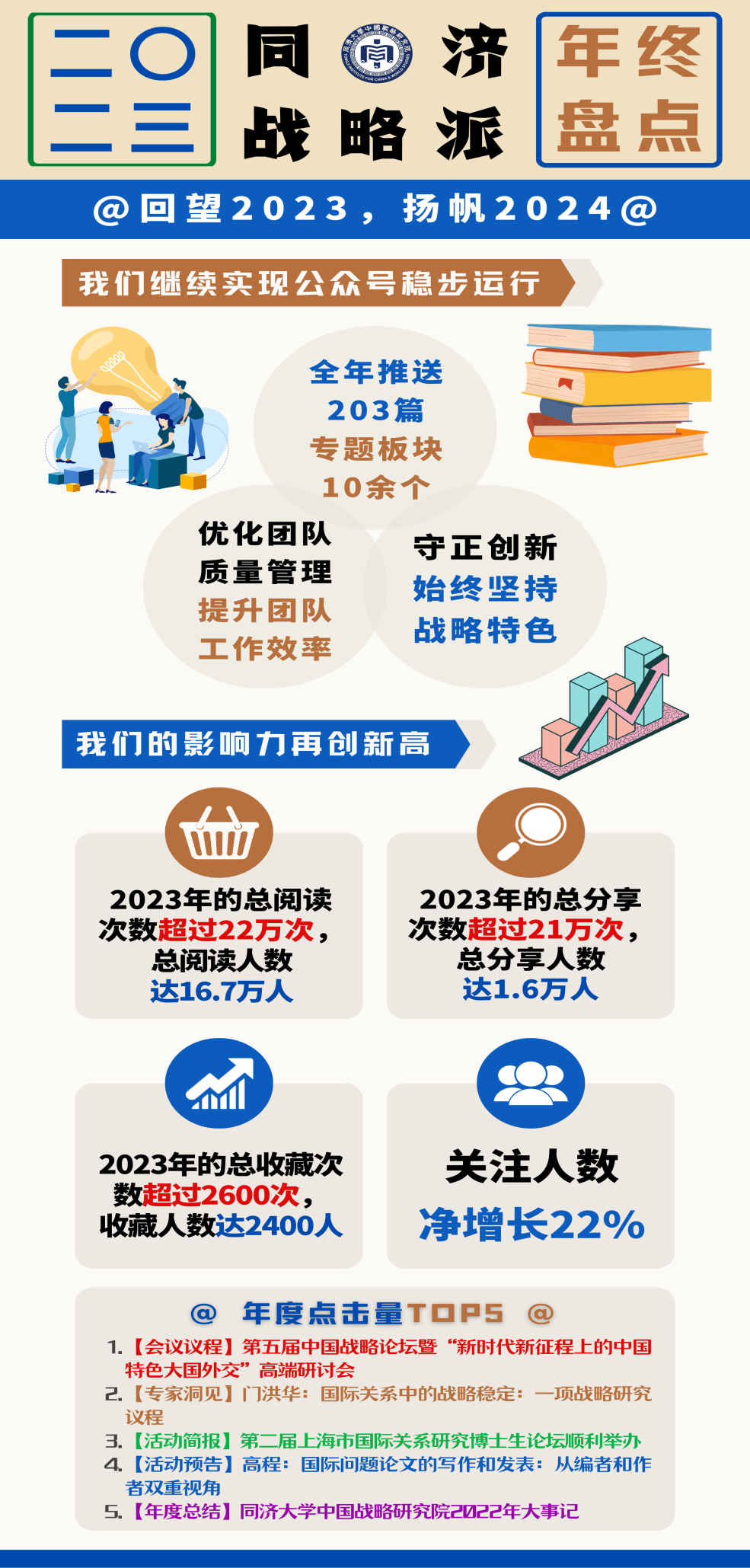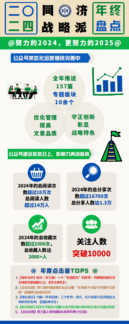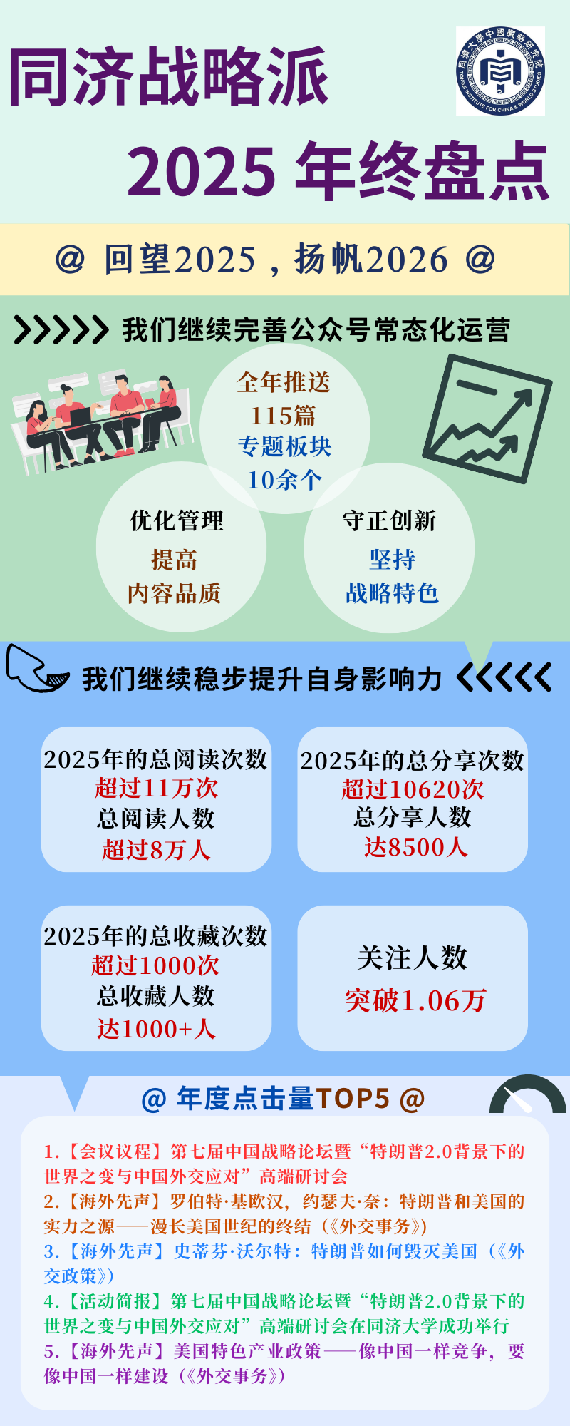 在宣传平台方面,yl6809永利官网集团中国战略研究院主持的“同济战略派”公众号在2025年团队不断壮大、运营稳步推进。2025年全年推送115篇文章,通过10余个专题板块坚持中国风格、彰显战略特色。据统计,2025年“同济战略派”关注人数突破1.06万人、总阅读量超过11万次、总阅读人数超过8万人、总分享次数超过1万次,总收藏次数超过1000次。回望2025年,同济战略派步履铿锵。展望2026年,同济战略派踔厉奋发,力争打造“中国本位、战略特色”的宣传平台。