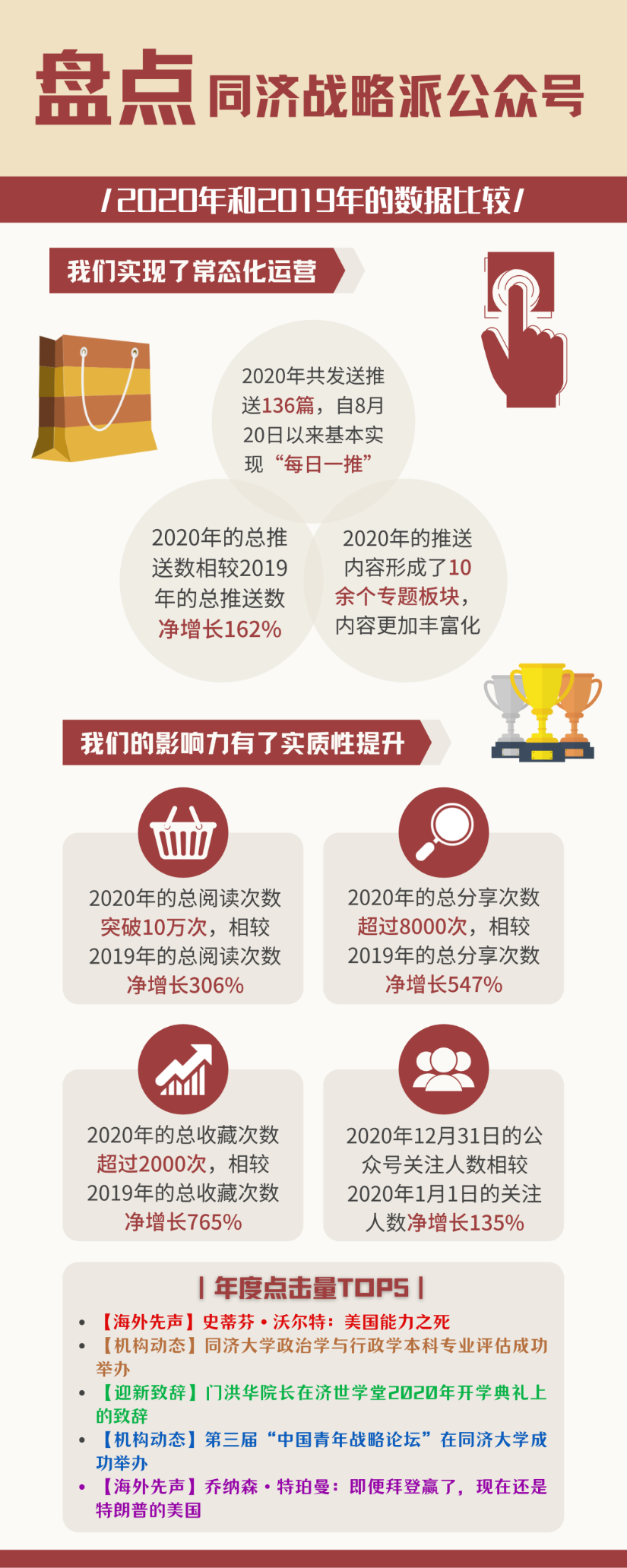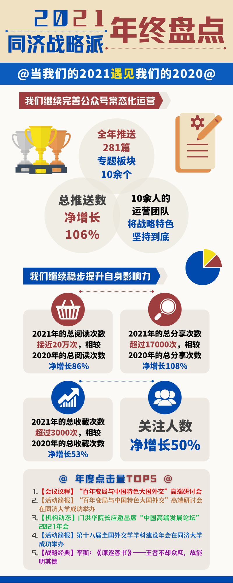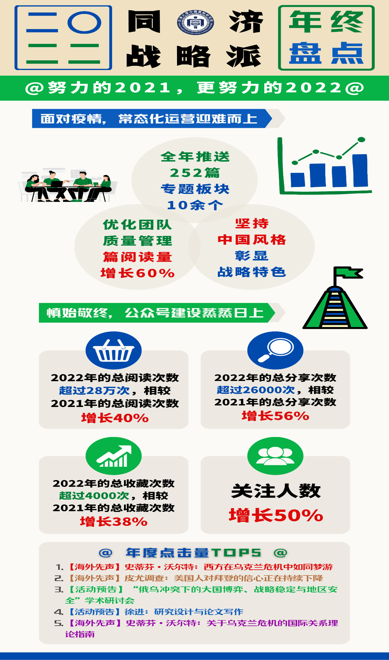 在宣传平台方面,yl6809永利官网集团中国战略研究院主持的“同济战略派”公众号在2025年团队不断壮大、运营稳步推进。2025年全年推送115篇文章,通过10余个专题板块坚持中国风格、彰显战略特色。据统计,2025年“同济战略派”关注人数突破1.06万人、总阅读量超过11万次、总阅读人数超过8万人、总分享次数超过1万次,总收藏次数超过1000次。回望2025年,同济战略派步履铿锵。展望2026年,同济战略派踔厉奋发,力争打造“中国本位、战略特色”的宣传平台。