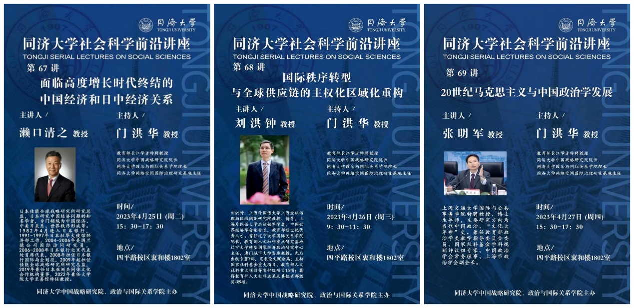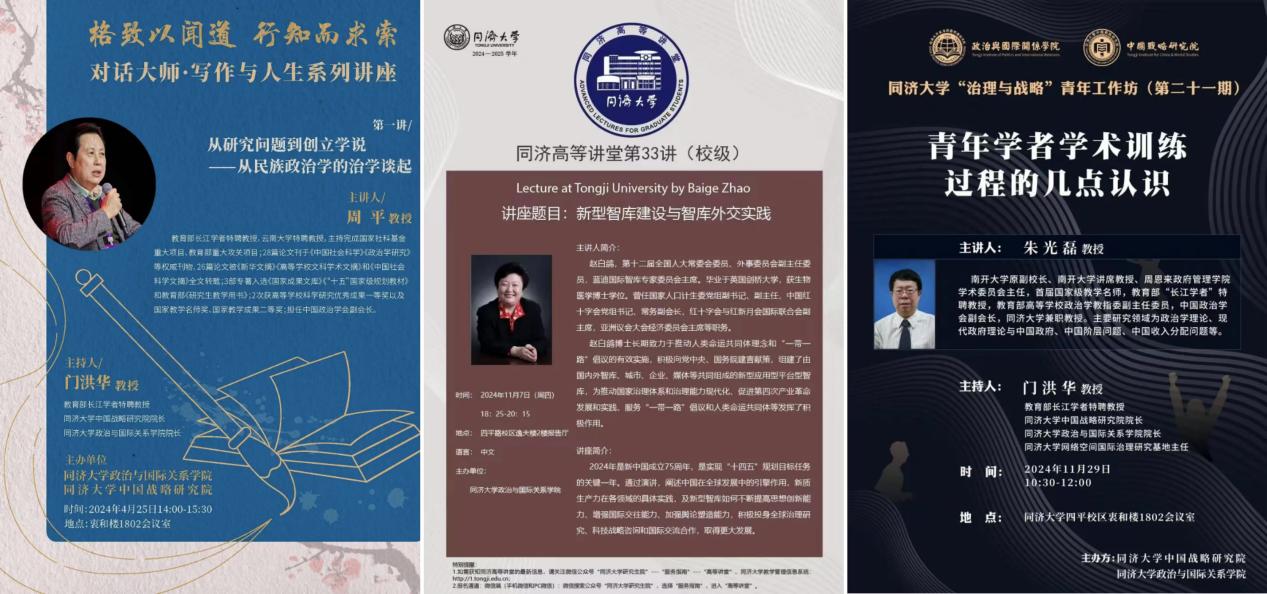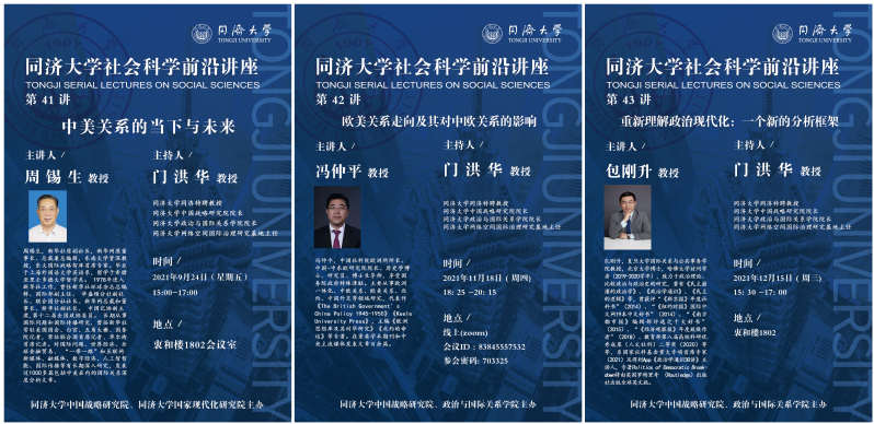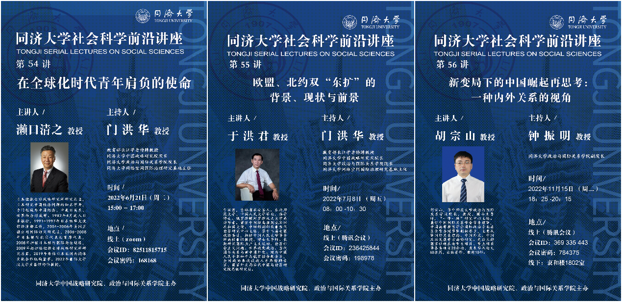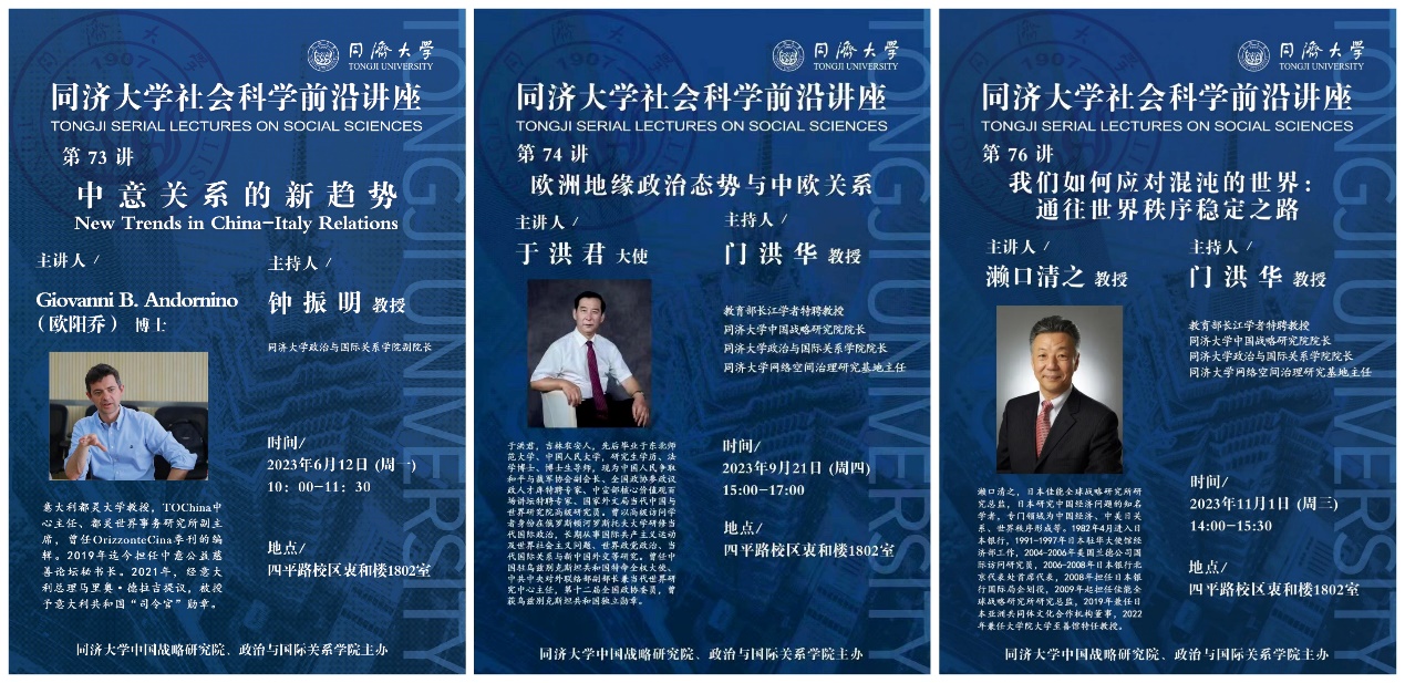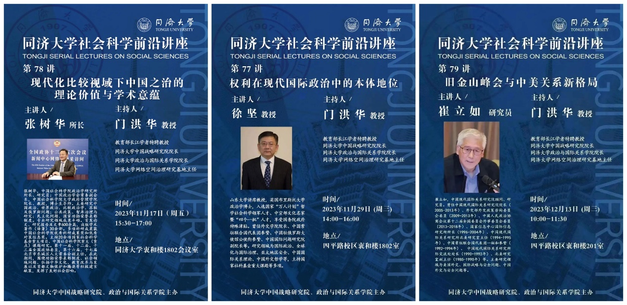 10月11日,中国社会科学院学部委员张蕴岭研究员以“百年变局与中国”为题,围绕提及“百年变局”的原因、“百年变局”的内涵以及“百年变局”的走向等核心问题,为同济师生展示了对中国与世界关系的战略观察;11月16日,中国现代国际关系研究院副院长冯仲平研究员以“欧洲一体化面临的挑战及发展前景”为题,从当前欧洲一体化面临的挑战、欧洲一体化受挫的原因、欧盟发展的前景及国际地位以及中欧关系等方面系统进行了系统阐述;11月26日,国家海洋局海洋发展战略研究所所长、第十三届全国政协委员张海文研究员以“全球海洋治理的热点问题”为题,就全球海洋治理的相关内涵、核心问题以及中国在国际海洋治理领域的理念行动进行了专业而详实的介绍;12月21日,中国社会科学院亚太与全球战略研究院研究员、《当代亚太》执行主编高程以“中美竞争背景下的中美关系和中国周边经营”为题,结合近期中美关系呈现出的新变化和新趋势,为同济师生介绍了自身对中国周边外交的理解和判断;12月28日,第十二届全国政协经济委员会驻会副主任、中国产学研合作促进会副会长石军教授以“中国经济体制转型方法论”为题,结合自身丰富的经济工作实践,从经济体制转型的动力、方法、原则和落实等方面,归纳总结了改革开放以来中国经济体制转型的基本经验。