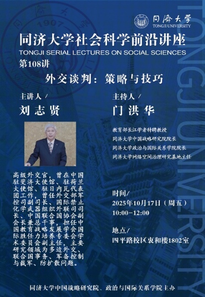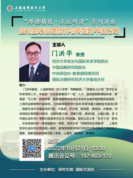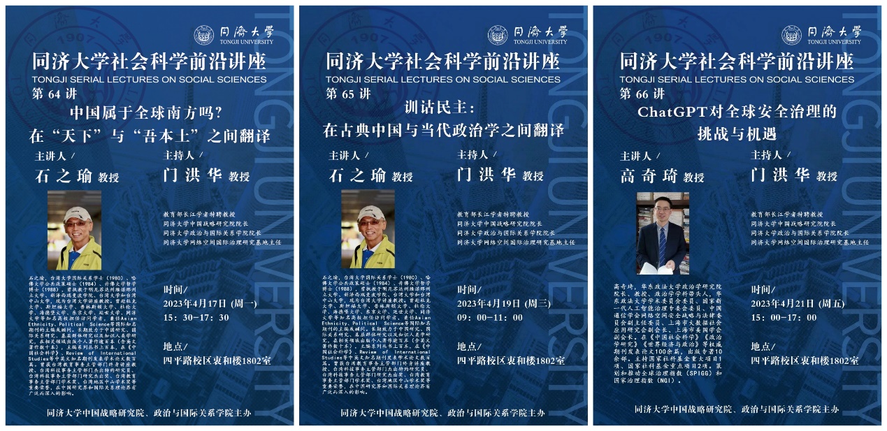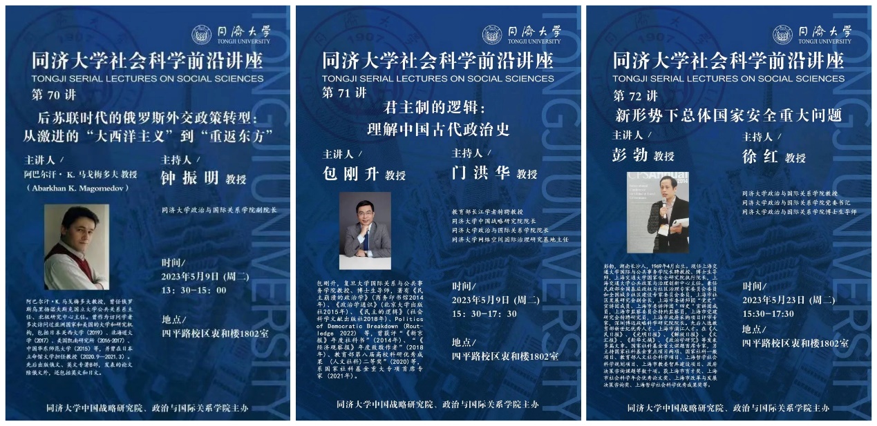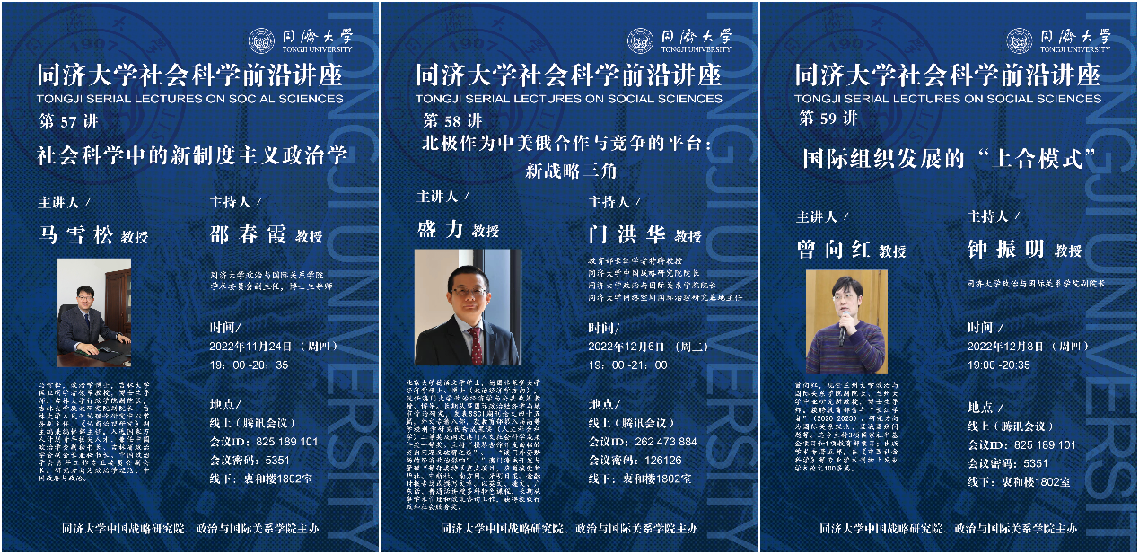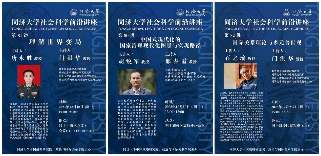 10月11日,中国社会科学院学部委员张蕴岭研究员以“百年变局与中国”为题,围绕提及“百年变局”的原因、“百年变局”的内涵以及“百年变局”的走向等核心问题,为同济师生展示了对中国与世界关系的战略观察;11月16日,中国现代国际关系研究院副院长冯仲平研究员以“欧洲一体化面临的挑战及发展前景”为题,从当前欧洲一体化面临的挑战、欧洲一体化受挫的原因、欧盟发展的前景及国际地位以及中欧关系等方面系统进行了系统阐述;11月26日,国家海洋局海洋发展战略研究所所长、第十三届全国政协委员张海文研究员以“全球海洋治理的热点问题”为题,就全球海洋治理的相关内涵、核心问题以及中国在国际海洋治理领域的理念行动进行了专业而详实的介绍;12月21日,中国社会科学院亚太与全球战略研究院研究员、《当代亚太》执行主编高程以“中美竞争背景下的中美关系和中国周边经营”为题,结合近期中美关系呈现出的新变化和新趋势,为同济师生介绍了自身对中国周边外交的理解和判断;12月28日,第十二届全国政协经济委员会驻会副主任、中国产学研合作促进会副会长石军教授以“中国经济体制转型方法论”为题,结合自身丰富的经济工作实践,从经济体制转型的动力、方法、原则和落实等方面,归纳总结了改革开放以来中国经济体制转型的基本经验。