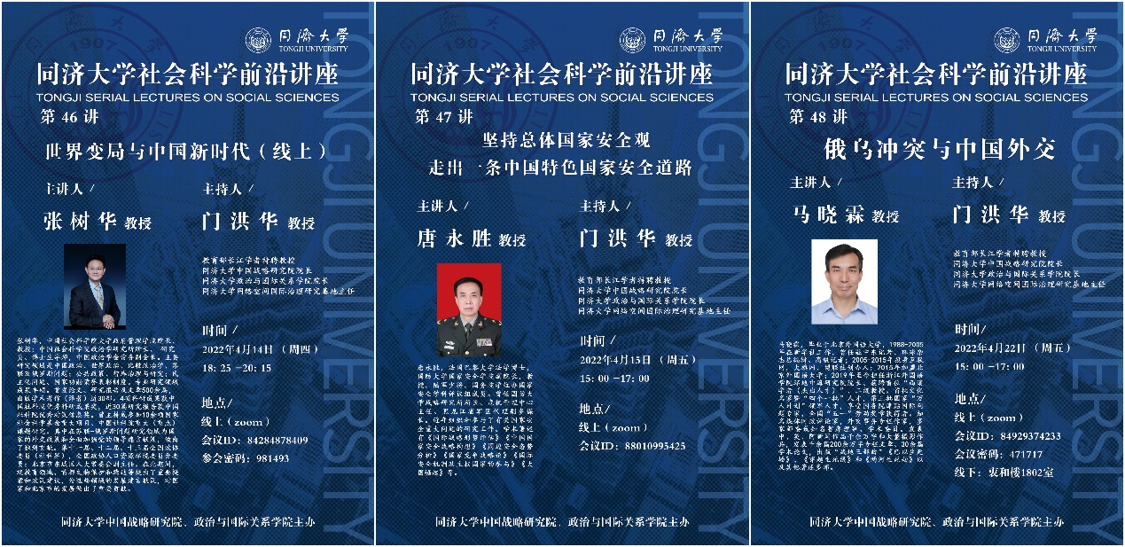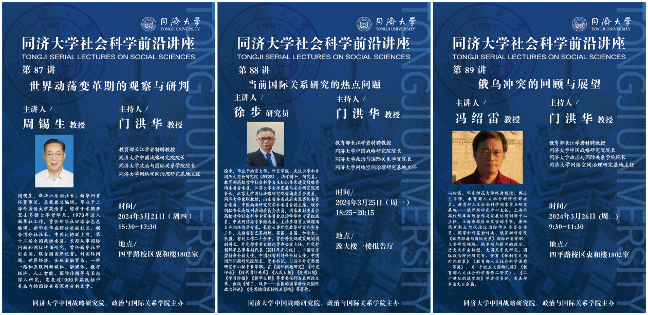 3月21日,新华社原副社长周锡生教授围绕“世界动荡变革期的观察与研判”展开主题演讲,向在场师生分析了当前世界百年未有之大变局的特点和中国的战略应对。3月25日,中国国际问题研究院原党委书记兼院长、中国原驻东盟使团团长兼大使、中国原驻智利大使徐步研究员受邀为同济师生作题为“当前国际关系研究的热点问题”的主题演讲,深入分析了当前国际局势和中国的政策方向,并在此基础上提出了当前国际关系研究的热点问题。3月26日,华东师范大学终身教授、教育部人文社会科学学部委员、教育部人文社会科学国家重点研究基地俄罗斯研究中心主任冯绍雷教授受邀以“俄乌冲突的回顾与展望”为主题,对俄乌冲突发生背景、现状及国际学界对冲突的看法、冲突形势的展望及未来国际秩序走向等方面进行了全面分析。