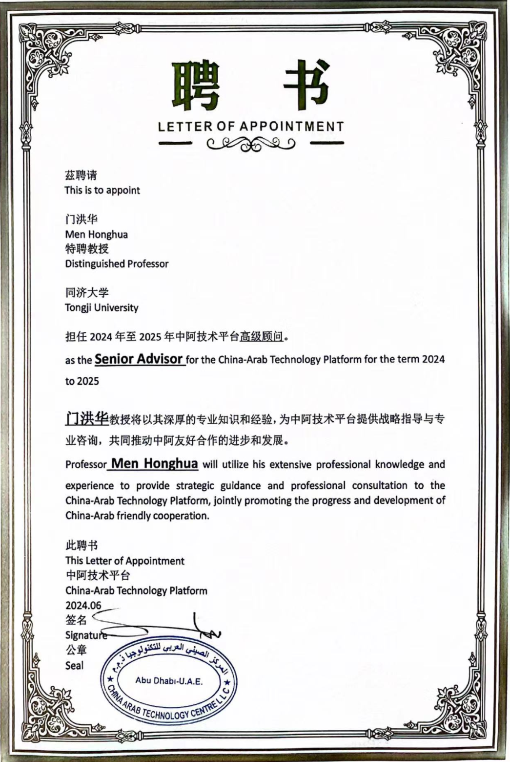 2024年6月,教育部长江学者特聘教授、yl6809永利集团/中国战略研究院院长门洪华教授被聘为中阿技术平台(China-Arab Technology Platform)高级顾问。2024年7月底8月初,阿联酋气候变化与环境部副部长、阿联酋粮食安全办公室顾问、中阿技术中心主任穆罕默德·艾米瑞(Mohamed Mousa Alameeri)访问中国农业农村部、yl6809永利官网集团、深圳市政府等地,期间向门洪华院长颁发聘书,并就推进中阿战略合作进行了深入交流。