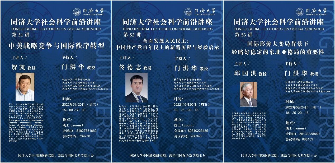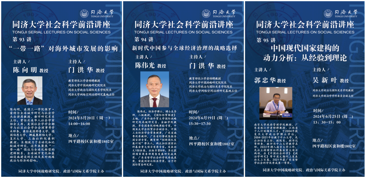 5月20日,美国三一学院陈向明教授以“‘一带一路’对海外城市发展的影响”为主题,向同济师生们讲述我国与“一带一路”沿线国家开展的城市建设合作与影响。6月19日,广东外语外贸大学金融学院教授、中国亚太学会经贸分会副会长、中国工业经济学会常务理事陈伟光教授受邀以“新时代中国参与全球经济治理的战略选择”为主题,系统梳理中国参与全球经济治理的历史演变与重要贡献。6月25日,南京大学政府管理学院郭忠华教授受邀为同济师生作题为“中国现代国家建构的动力分析——从经验到理论”的主题演讲,从理论和实证两个层面深入阐述现代国家建构的动力问题。