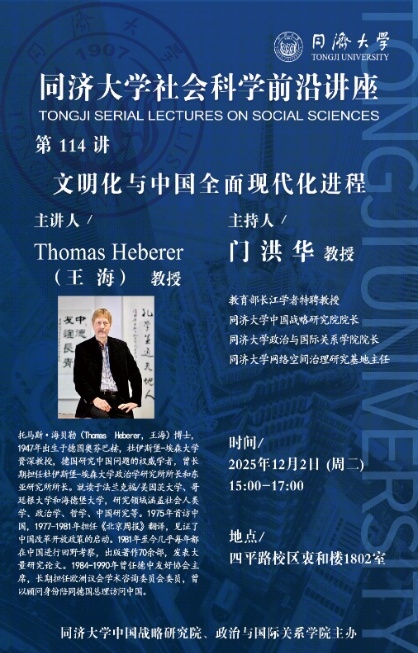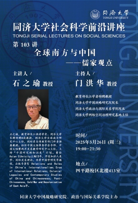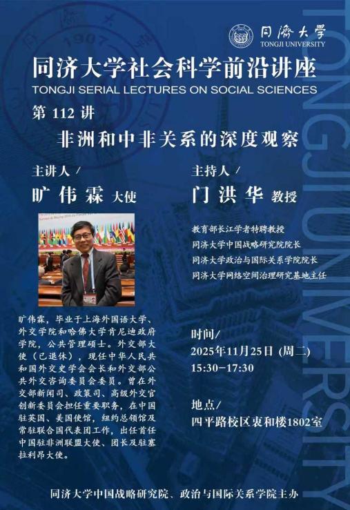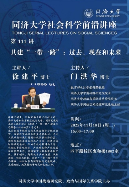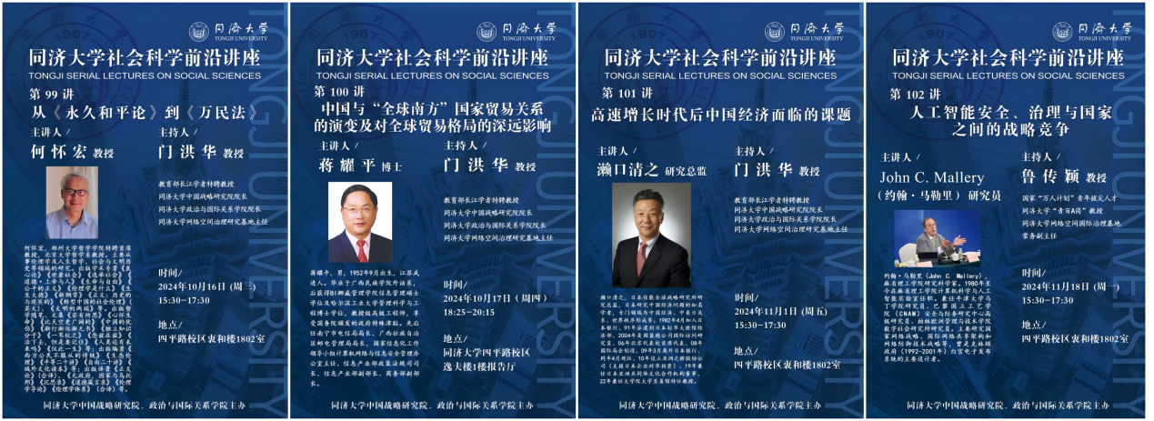 10月16日,北京大学哲学系何怀宏教授受邀开展“从《永久和平论》到《万民法》”的主题讲座,对康德的两部著作进行细致解读。10月17日,商务部原副部长将耀平博士受邀为同济师生作题为“中国与‘全球南方’国家贸易关系的演变及对全球贸易格局的深远影响”的主题演讲,详细讲述中国与“全球南方”国家贸易关系演变的历史及其重要意义。11月1日,日本佳能全球战略研究所研究总监濑口清之先生受邀开展以“高速增长时代后中国经济面临的课题”为主题的讲座,对目前的中国经济现状、外资企业对华投资、世界大变局之下的中日合作三个方面展开深入讲解。11月18日,麻省理工学院研究科学家约翰·马勒里(John C .Mallery)受邀作“人工智能安全、治理与国家之间的战略竞争”主题讲座,深入分析人工智能治理的国际经验以及大国人工智能战略竞争的现状。