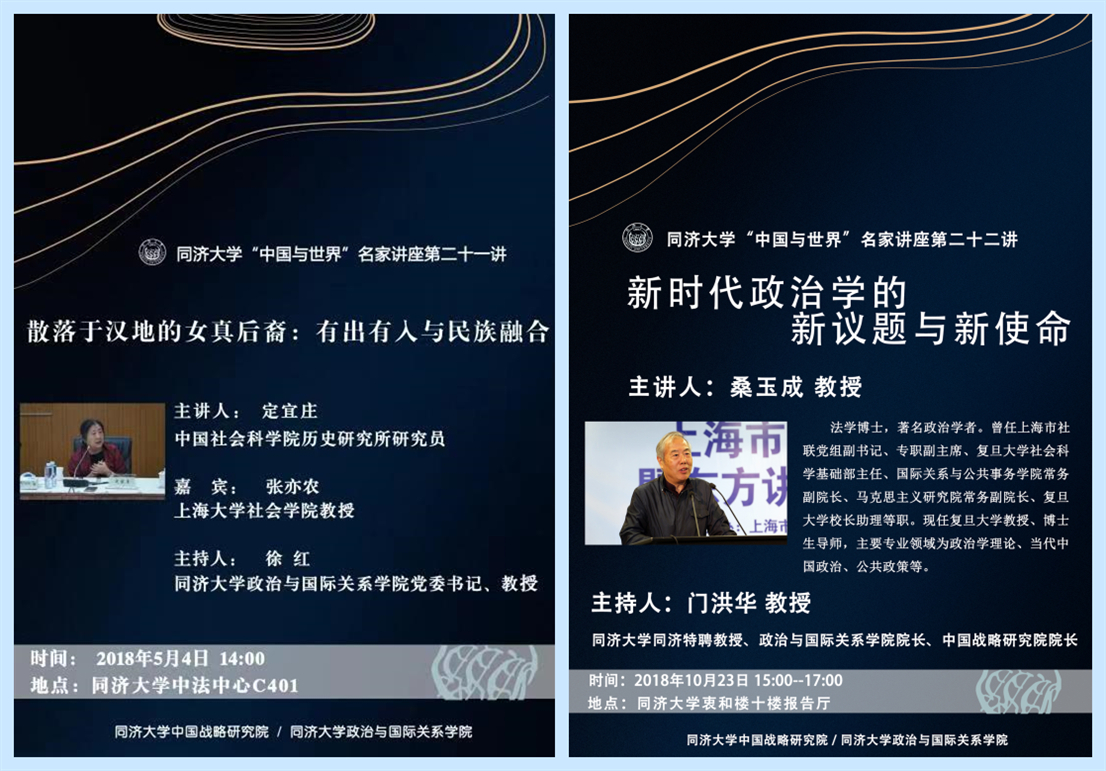推进“中国与世界名家讲座”,彰显名家风采,夯实学术品牌。2018年5月4日,中国社会科学院历史研究所定宜庄研究员为同济师生发表了题为“散布于汉地的女真后裔:有出有入与民族融合”的精彩演讲。她以迄今为止散布于中原汉地的女真后人粘氏家族切入,探讨了自金朝灭亡迄今八百余年,散落于中原汉地的女真后裔在中原汉地采取何种方式保持族群身份和认同等问题。10月23日,复旦大学国际关系与公共事务学院桑玉成教授以“新时代政治学的新议题与新使命”为主题,结合自身从事政治学研究的感受,探讨了政治学研究关注的核心问题、当今政治学面对的新议题以及政治学人所需承担的新使命。