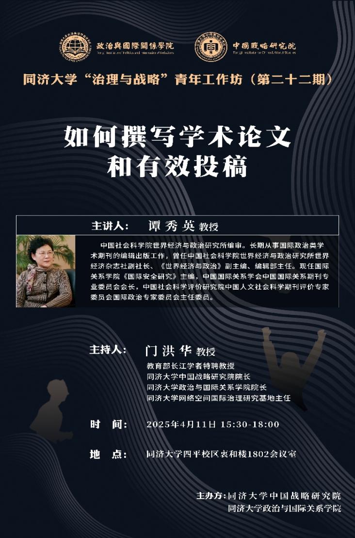 “治理与战略”青年工作坊持续举办。2017年3月17日,上海交通大学国际与公共事务学院黄琪轩副教授作了题为“大国如何处理失败的竞争者:国际关系中的关联利益与国际秩序”的精彩演讲。2017年4月19日,复旦大学国际关系与公共事务学院熊易寒副教授受邀做题为“从扁平社会到精细分层社会:中国的中等收入群体距离中产阶级有多远?”的演讲。2017年5月18日,中国社科院亚太与全球战略研究院大国关系研究室主任钟飞腾研究员,举行了主题为“中国崛起与秩序重构”的专题讲演。2017年6月21日,美国内华达大学政治学系助理教授蒲晓宇博士就“世界政治中的地位:老概念、新研究”为同济师生做主题演讲。2017年6月26日,yl6809永利集团社会学系讲师陈晋博士做题为“时空认知的文化逻辑:人类学视角与民族志案例”的分享。2017年12月15日,中国人民大学国际关系学院尹继武教授就“中美关系中的信号与沟通”发表了自己的专业见解。