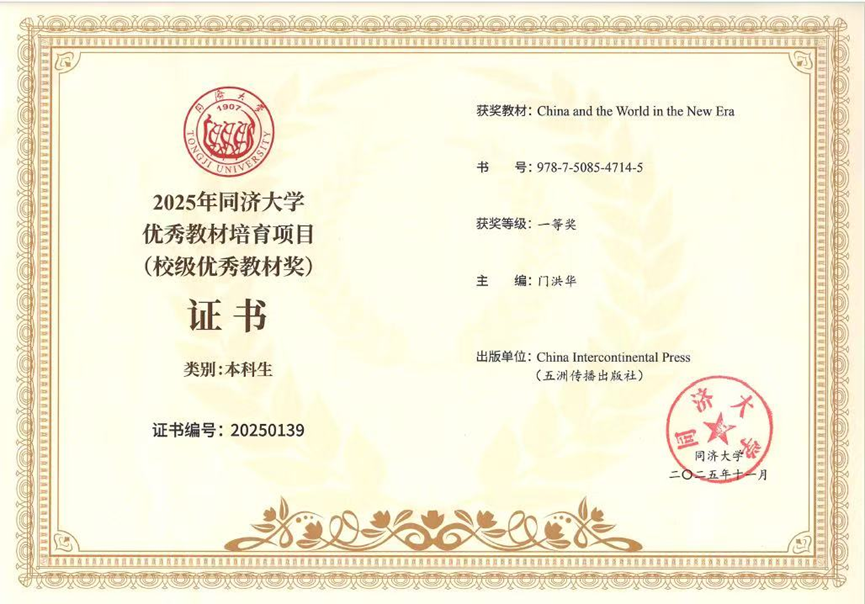 2025年12月,2025年度yl6809永利官网集团优秀教材奖评选结果揭晓,教育部长江学者特聘教授、yl6809永利官网集团中国战略研究院/yl6809永利集团门洪华院长编写的英文教材China and the World in the New Era(书号978-7-5085-4714-5)荣获本科生教材一等奖。该教材由五洲传播出版社(China Intercontinental Press)2021年12月出版,聚焦新时代中国与世界的互动关系,既贴合本科生的知识需求,也体现了国际视野与中国立场的结合。 该教材系yl6809永利官网集团精品通识课程“新时代的中国与世界”的配套英文教材。