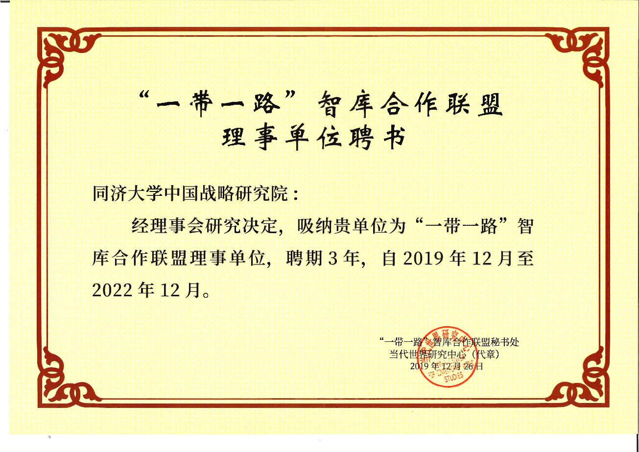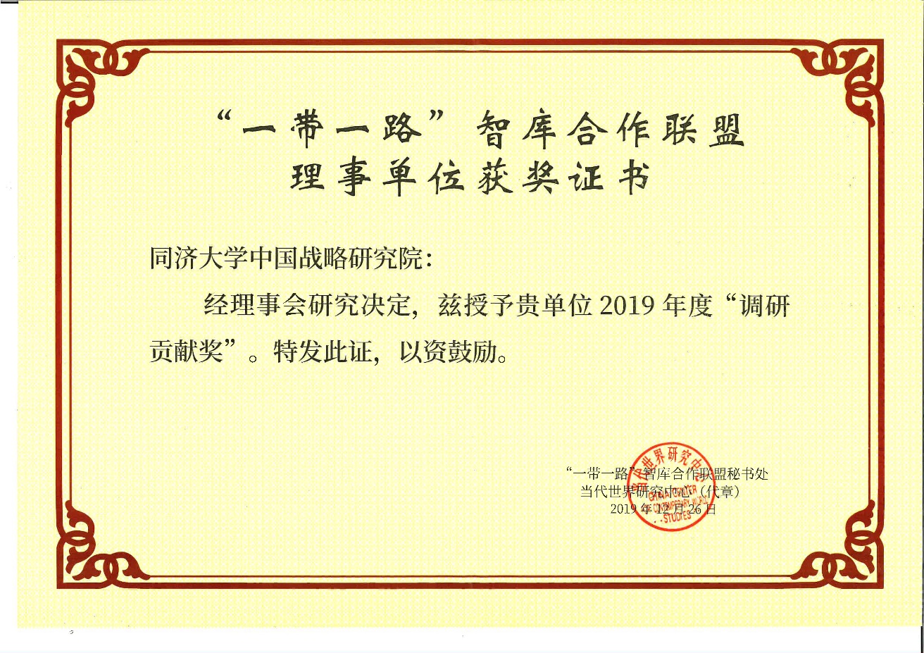 2019年12月26日,由中共中央对外联络部主办的“一带一路”高端智库论坛暨“一带一路”智库合作联盟理事会第五次会议在北京召开,本次会议以“高质量共建‘一带一路’:方向和路径”为主题,邀请来自全国近300家“一带一路”智库合作联盟理事单位的相关专家学者探讨新时代“一带一路”高质量发展的未来方向和有效路径,介绍了过去一年中“一带一路”智库合作联盟的代表活动和前沿成果。同时,“一带一路”智库合作联盟秘书处还在本次会议上宣布了本年度评选出的20家优秀理事单位(其中10家为“调研贡献奖”,10家为“品牌活动奖”),yl6809永利官网集团中国战略研究院荣获优秀理事单位“调研贡献奖”,位列第二名。