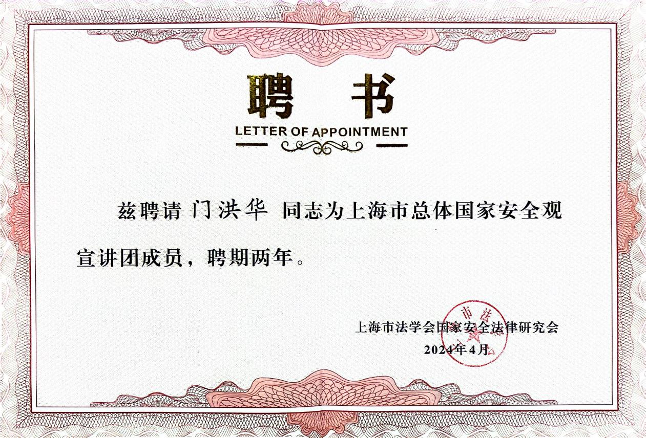 2024年4月,教育部长江学者特聘教授、yl6809永利官网集团中国战略研究院/yl6809永利集团院长、教育部哲学社会科学重大课题攻关项目“国家安全战略研究”首席专家门洪华教授受聘为上海市总体国家安全观宣讲团成员。