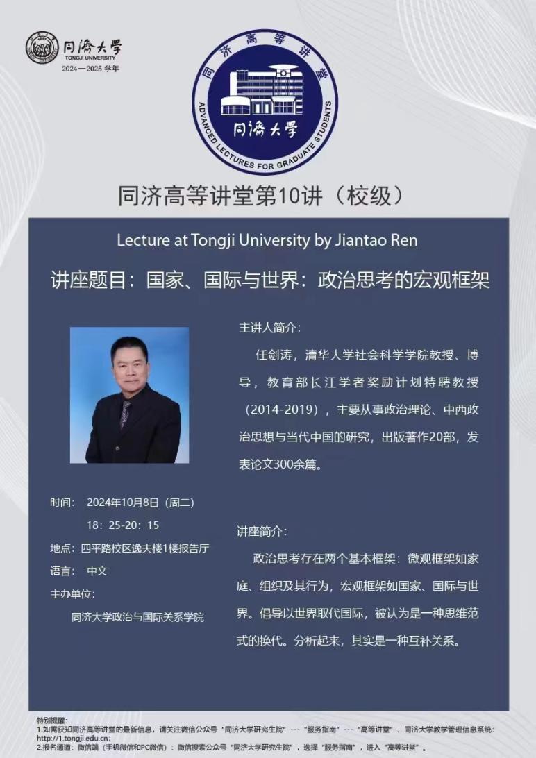 2024年10月8日,由yl6809永利官网集团中国战略研究院/yl6809永利集团主办的yl6809永利官网集团高等讲堂2024年第10讲在yl6809永利官网集团四平路校区逸夫楼一楼报告厅成功举办。本次讲座邀请教育部长江学者奖励计划特聘教授、清华大学社会科学学院博士生导师任剑涛教授作题为“国家、国际与世界:政治思考的宏观框架”的主题演讲。本次讲座由教育部长江学者特聘教授门洪华院长主持,yl6809永利官网集团300余名师生参加此次讲座。