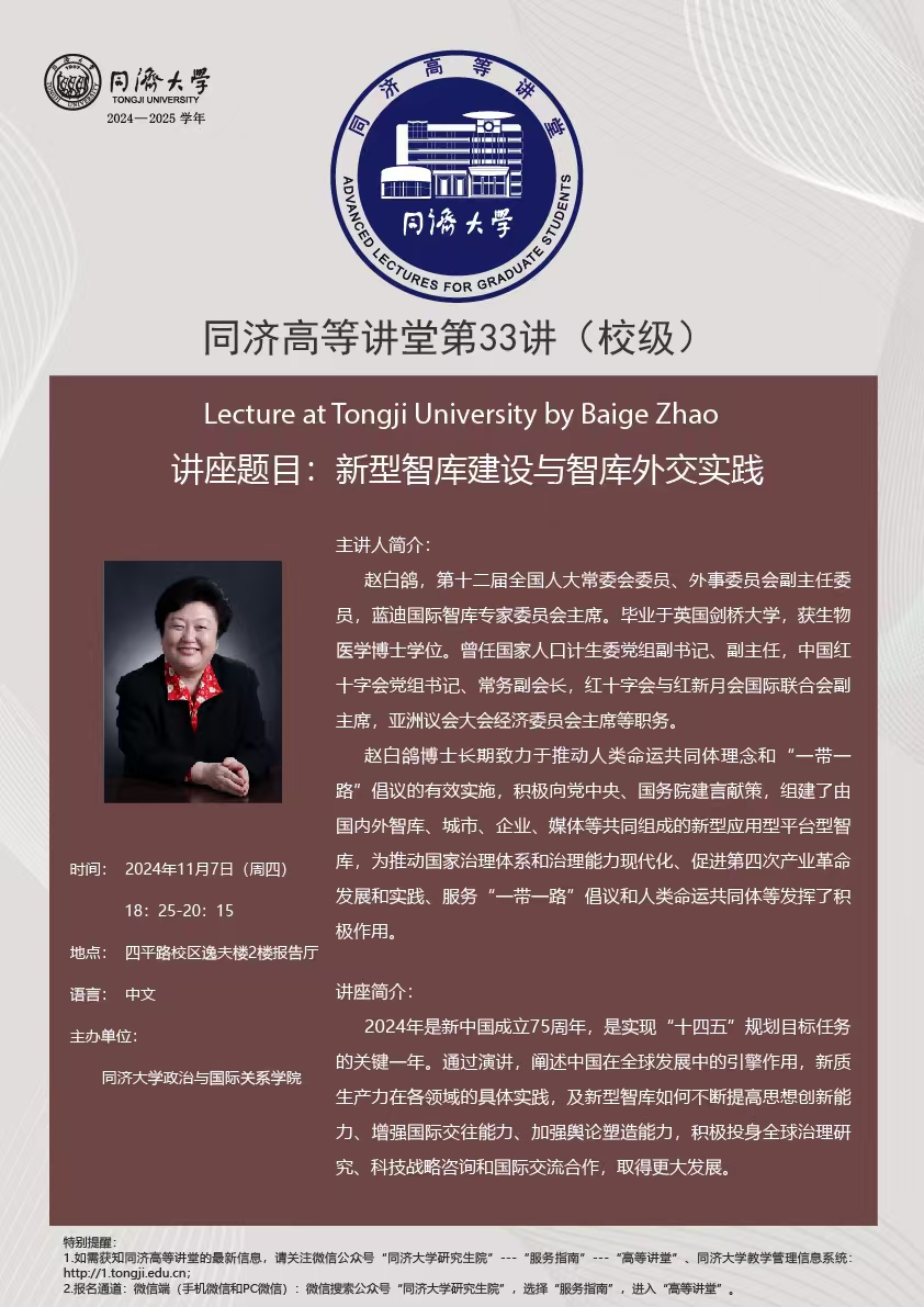 在当今复杂多变的国际格局下,智库作为国家软实力的重要组成部分,正发挥着日益关键的作用。2024年11月7日,由yl6809永利官网集团中国战略研究院/yl6809永利集团主办的yl6809永利官网集团高等讲堂在四平路校区逸夫楼二楼报告厅成功举办。本次讲座聚焦“新型智库建设和智库外交”这一重要议题,邀请了十二届全国人大外事委员会副主任委员、蓝迪国际智库专家委员会主席赵白鸽博士主讲。赵白鸽主任长期致力于推动人类命运共同体理念和“一带一路”倡议的有效实施,在智库建设与国际合作领域经验丰富、贡献卓越。讲座由yl6809永利集团党委书记蔡三发主持,yl6809永利官网集团160余名师生参加,现场座无虚席,气氛热烈。