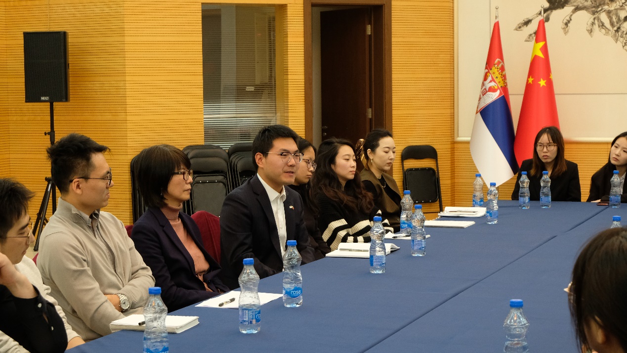当天下午,代表团访问中国驻塞尔维亚大使馆并受到张喆公参的亲切接见。宋黎磊教授首先介绍了本次访塞行程,驻塞使馆谢波参赞、政治处王劲松及各部门青年工作代表与同济师生进行座谈交流。