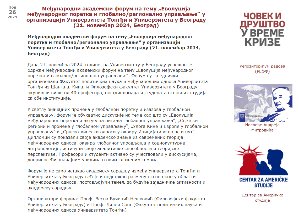 塞尔维亚贝尔格莱德大学亦对此次论坛在官网进行了相关报道。