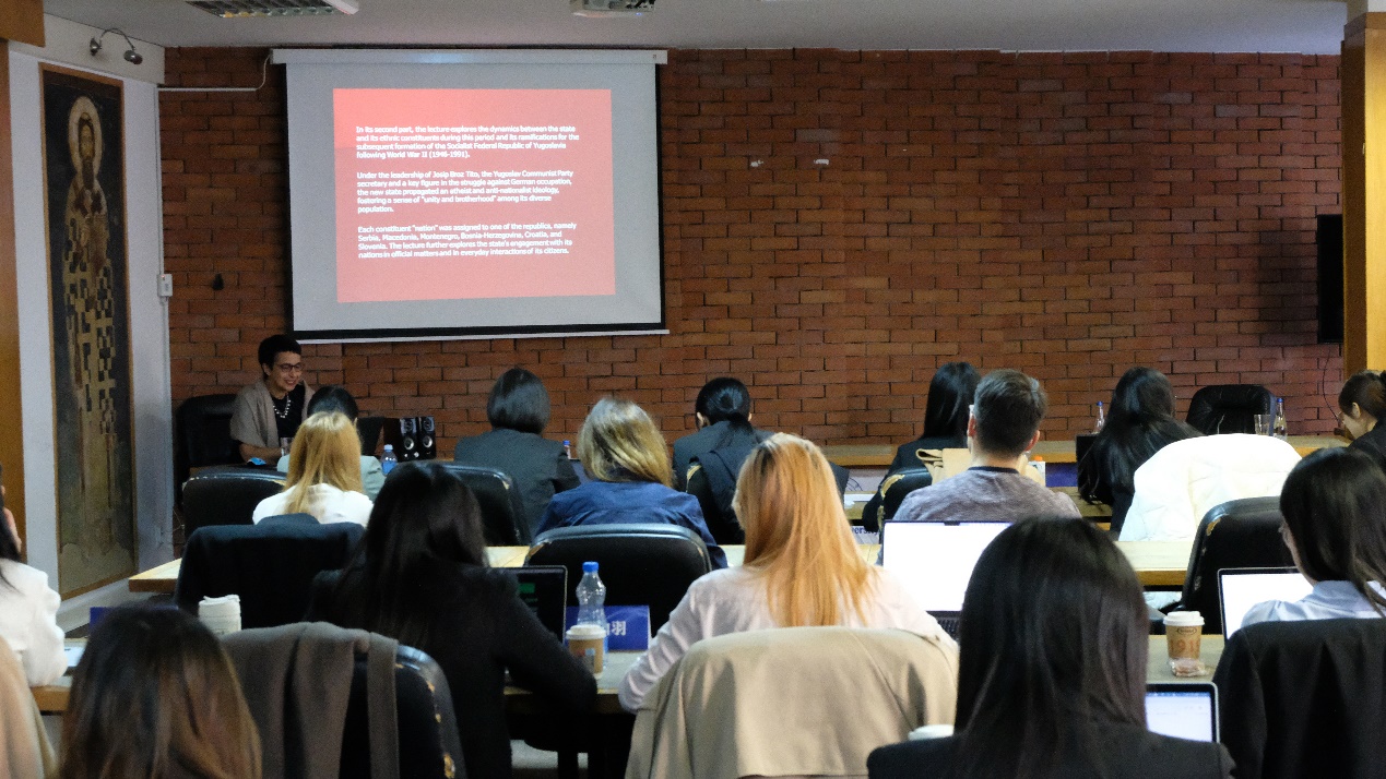 当天下午,武契尼奇教授和来自塞尔维亚国际政治与经济研究所的卡塔琳娜·扎基奇(Katarina Zakić)研究员分别就“南斯拉夫与塞尔维亚的民族与国家的关系”以及“‘一带一路’倡议下的中塞尔合作”进行了学术分享。武契尼奇的讲座回顾了塞尔维亚在不同历史时期对于民族和国家看法的演变,认为一战、二战、南斯拉夫解体为观念变迁的重要节点,武契尼奇教授的讲座丰富了在场师生对于塞尔维亚的历史和发展的了解。扎基奇研究员条分缕析地梳理了中塞两国在政治、贸易、科学合作过程中所面临的挑战,特别鼓励塞尔维亚学生学习中文和实地了解中国发展成就,进一步增进中塞人民的相互理解。