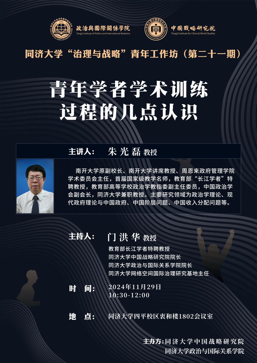 2024年11月29日,由yl6809永利官网集团中国战略研究院/yl6809永利集团主办的yl6809永利官网集团“治理与战略”青年工作坊第二十一期在yl6809永利官网集团衷和楼1802会议室成功举办。本次讲座邀请南开大学原副校长、南开大学讲席教授、周恩来政府管理学院学术委员会主任朱光磊教授作题为“青年学者学术训练过程的几点认识”的主题演讲。本次讲座由门洪华院长主持,yl6809永利集团青年教师、博士生40余人参加此次讲座。