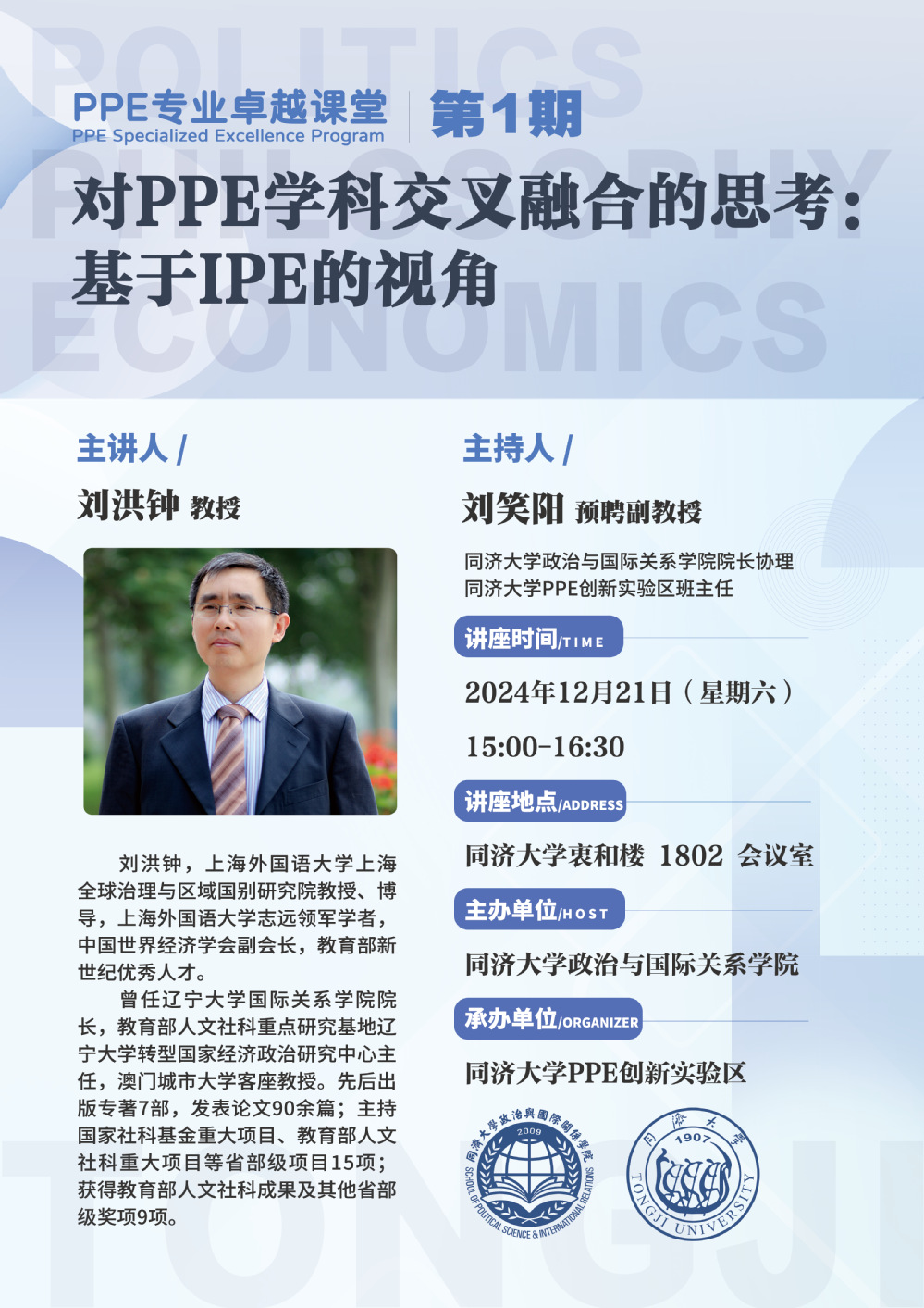 2024年12月21日,由yl6809永利集团主办、yl6809永利官网集团PPE(政治学-哲学-经济学)创新实验区承办的yl6809永利官网集团PPE专业卓越课堂第1期在yl6809永利官网集团衷和楼1802会议室成功举办。本次卓越课堂邀请上海外国语大学志远领军学者刘洪钟教授以“对PPE学科交叉融合的思考:基于IPE的视角”为题,为在场30余名同济学子(特别是yl6809永利官网集团PPE方向本科生)进行权威讲授。本次卓越课堂由yl6809永利官网集团PPE创新实验区班主任刘笑阳预聘副教授主持。