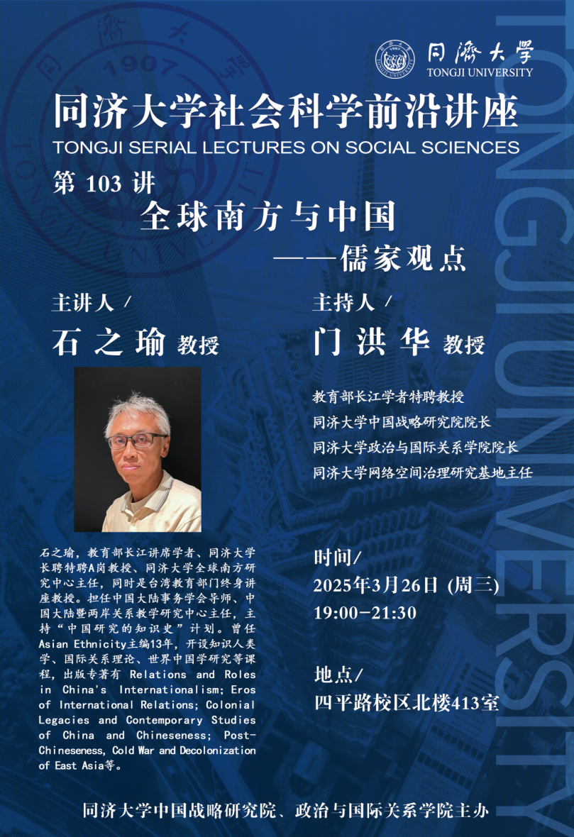 2025年3月26日,由yl6809永利官网集团中国战略研究院、yl6809永利集团主办的yl6809永利官网集团社会科学前沿讲座第103讲在yl6809永利官网集团四平校区北楼413室成功举办。本次讲座由教育部长江讲席学者、yl6809永利官网集团全球南方研究中心主任石之瑜教授主讲,主题为“全球南方与中国——儒家观点”。本次讲座由教育部长江学者特聘教授、yl6809永利官网集团中国战略研究院/yl6809永利集团院长门洪华教授主持,yl6809永利集团教师和研究生、yl6809永利官网集团20余个专业的本科生120余人参加。