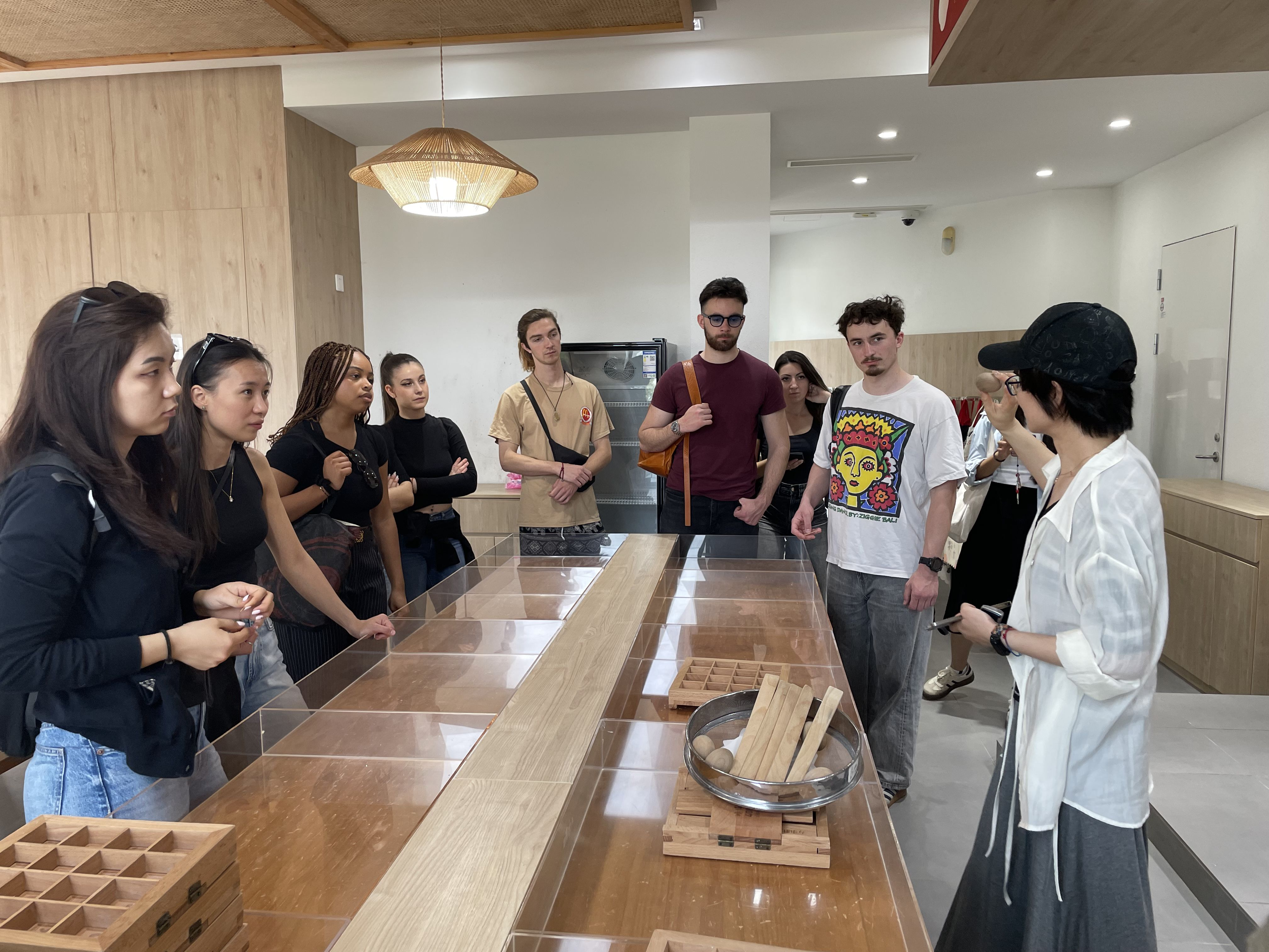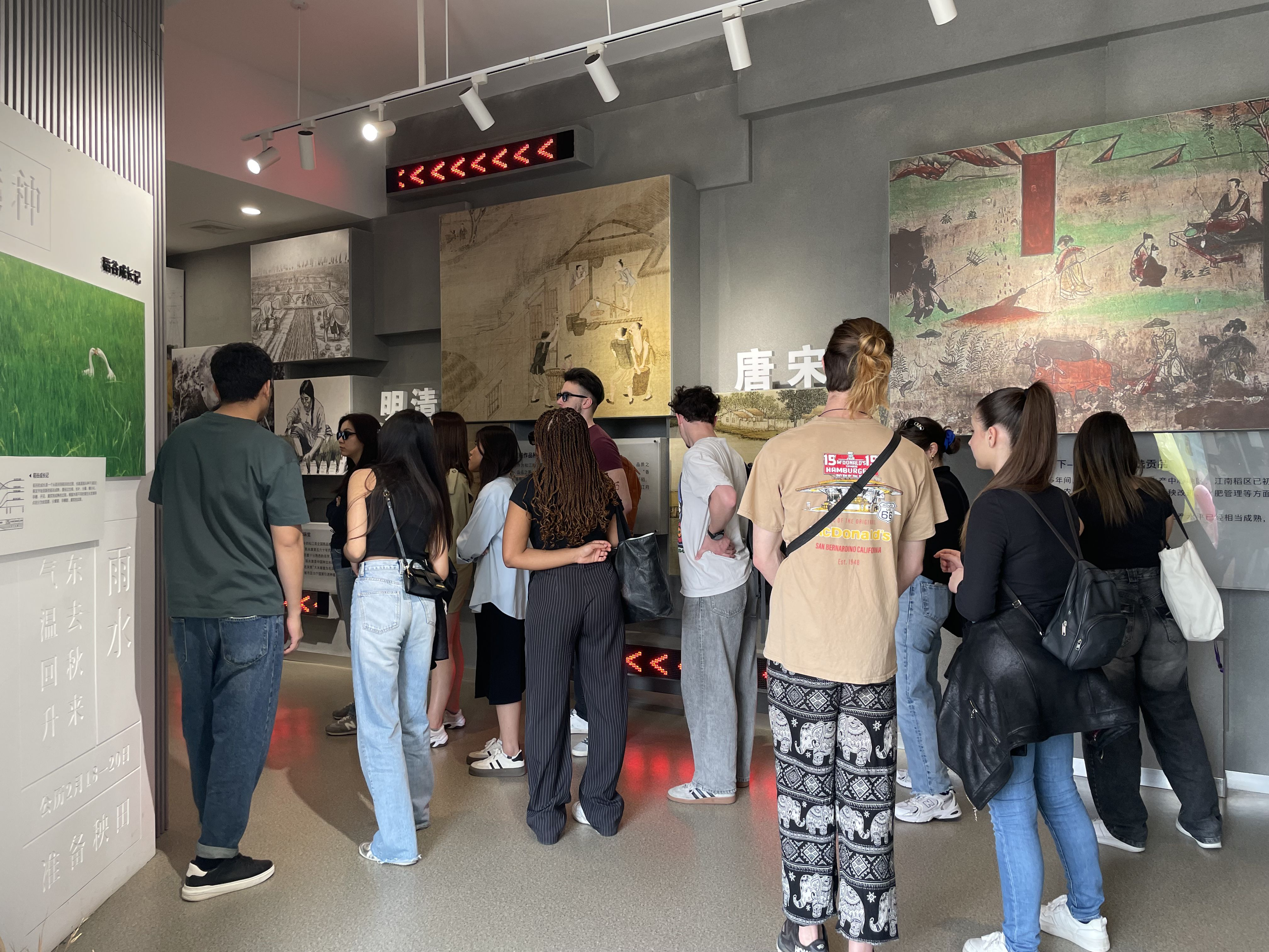 穿过田野,同学们来到建设在稻田中间的“大米文化体验馆”,在这里参观展览,了解稻米的农耕历史以及中国特有的农业文化。大家还饶有兴趣地观摩了非物质文化遗产——有着400多年历史的叶榭软糕的制作。工作人员邀请大家品尝这种出自传统手工的本地点心,散发着大米清香的叶榭软糕让异国的学子们赞不绝口。