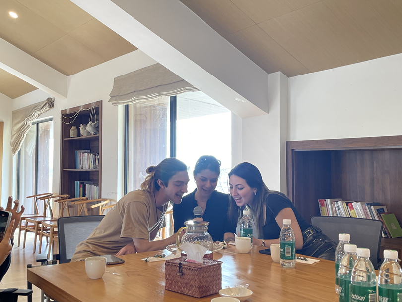 而后,同学们来到多功能会议厅,在钟晓华老师和刘渝梅老师的带领下,在这里座谈、研讨。来自不同国家和文化背景的同学们,就所见所闻和学习心得展开交流。品茗谈笑间,不同的文化在这里碰撞,多元的知识在这里汇集,迸放出炫丽的思想火花。
