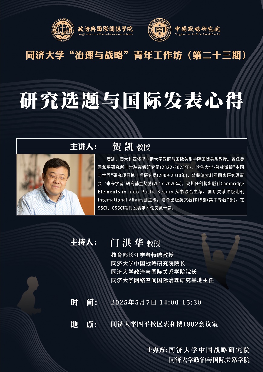 2025年5月7日,由yl6809永利官网集团中国战略研究院/yl6809永利集团主办的yl6809永利官网集团“治理与战略”青年工作坊第二十三期在yl6809永利官网集团衷和楼1802会议室成功举办。本次讲座邀请澳大利亚格里菲斯大学治理与公共政策研究中心主任、政府与国际关系学院贺凯教授作题为“研究选题与国际发表心得”的主题演讲。本次讲座由教育部长江特聘教授门洪华院长主持,yl6809永利官网集团yl6809永利集团及校内外教师、博士生、硕士生30余人参加了此次学术讲座。