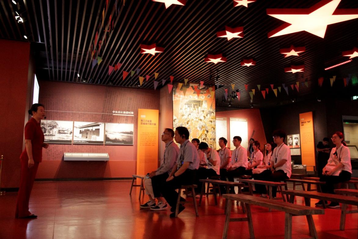 9月13日,调研团队前往中央革命军事委员会旧址、云石山革命旧址、中华苏维埃共和国中央政府办事处等开展调研。在中央红军长征决策和出发历史展览馆内,调研团队以实地为课堂,开展了一堂鲜活的红色思政课。成员们在沉浸式调研学习中,亲身体悟老一辈革命家的艰辛征程,聆听党的历史脉动,以实际行动践行“把论文写在祖国大地上”的时代号召,让理论学习与红色实践深度融合。