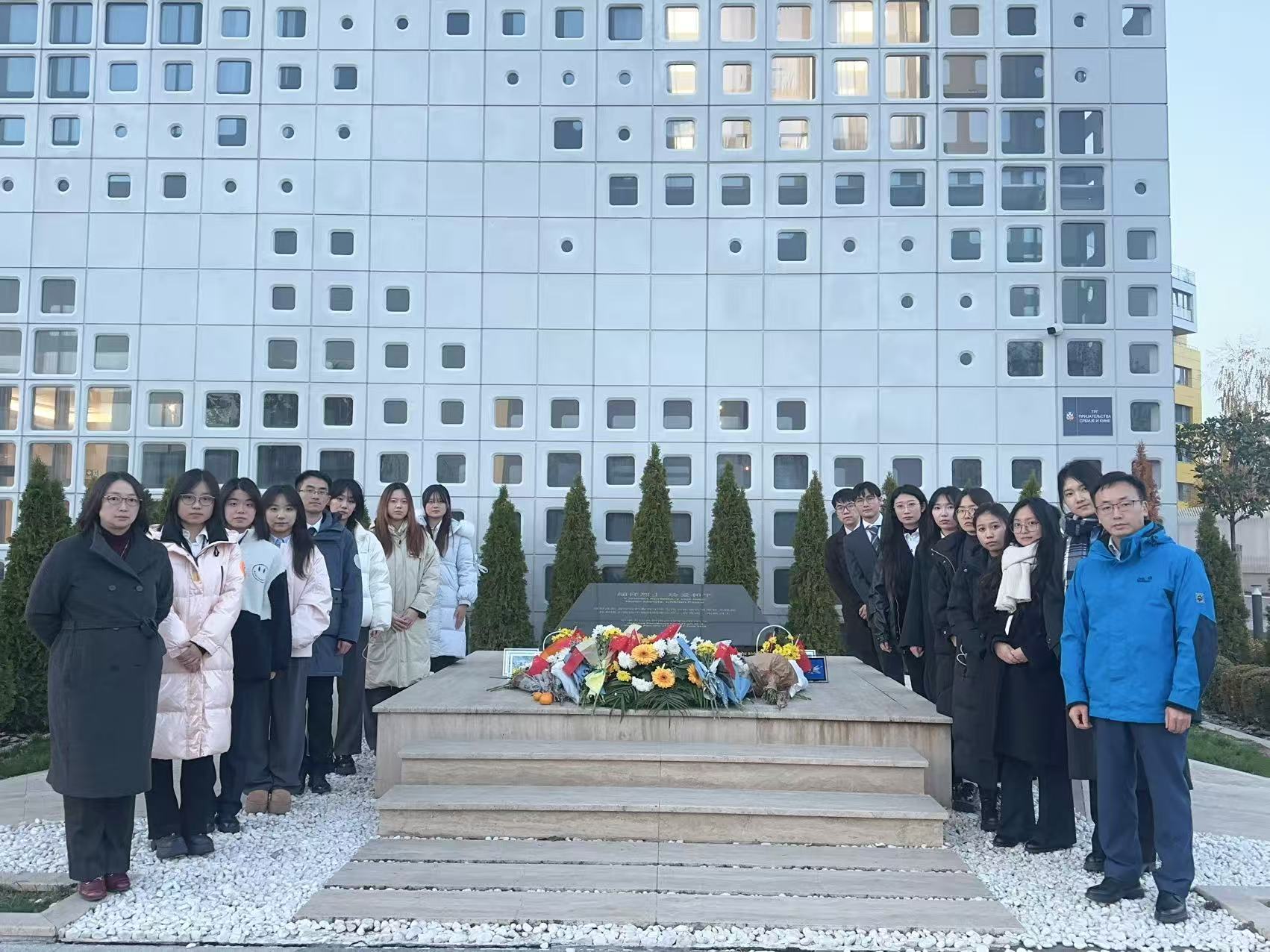 当天会议结束后,代表团前往中国驻前南联盟被炸使馆旧址,开展爱国主义教育活动,师生代表向烈士敬献鲜花,在肃穆的氛围中深切缅怀为外交事业牺牲的先辈。