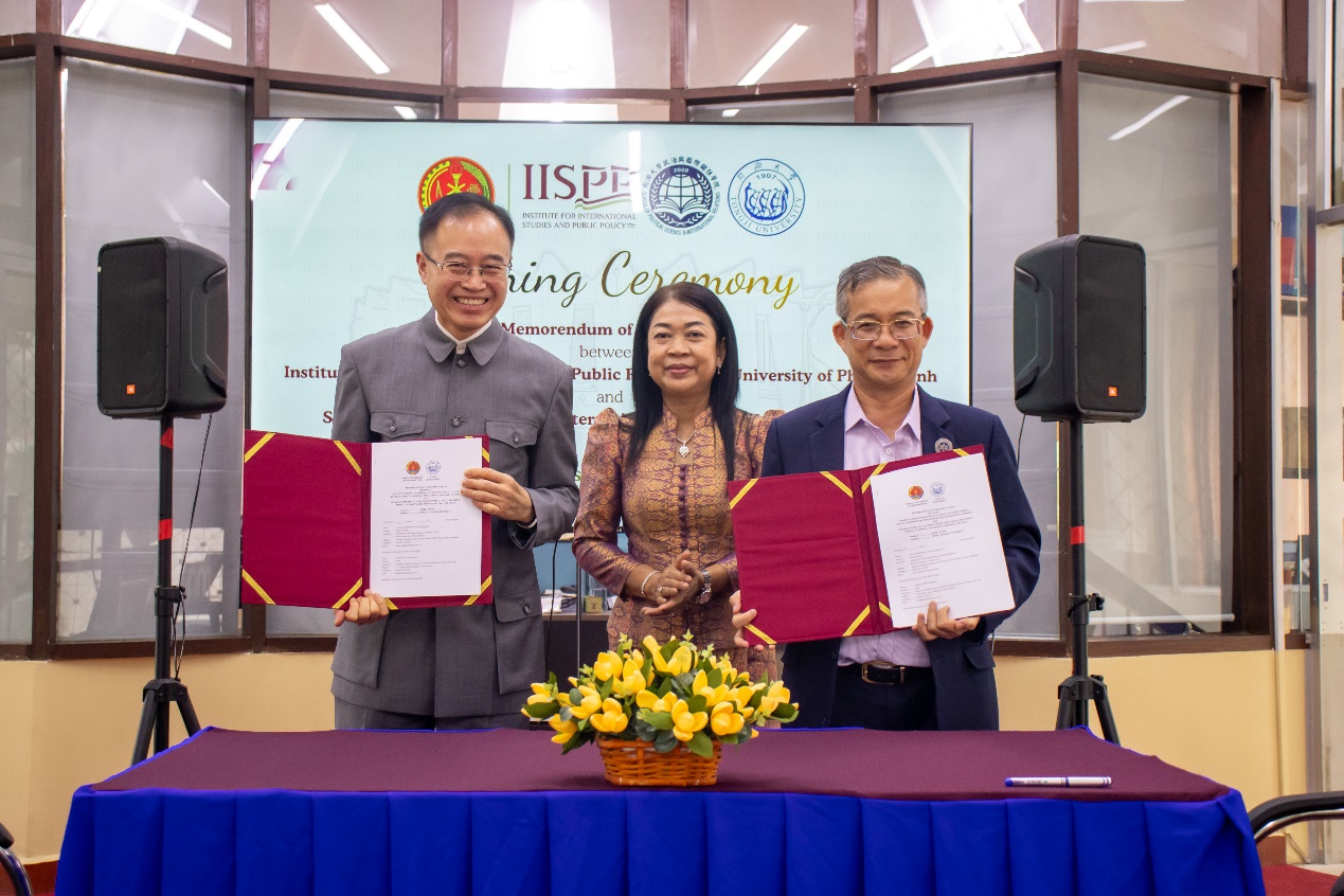 1月13日下午,yl6809永利官网集团代表团赴柬埔寨金边皇家大学访问,门洪华院长和金边皇家大学国际研究与公共政策学院院长尼克·占达利(NEAK Chandarith)教授代表两校签署合作备忘录,金边皇家大学副校长欧姆·拉维(OUM Ravy)教授见证,中国驻柬埔寨大使馆参赞王志全、柬埔寨首相办公室副国务秘书LAO Meng、柬埔寨公共工程与运输部顾问何树林、柬埔寨参议院第二副主席办公室副主任索恩·波夫(SORN Pov)、中国和平发展基金会柬埔寨办事处主任王亚辉等出席签约仪式。