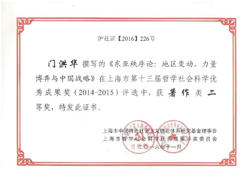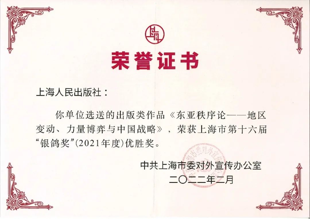 2022年2月,由中共上海市委对外宣传办公室组织开展的上海市第十六届“银鸽奖”(2021年度)评选活动结果揭晓,由上海人民出版社选送,门洪华院长撰写的专著《东亚秩序论:地区变动、力量博弈与中国战略》(上海人民出版社2015年版)荣获上海市“银鸽奖”(2021年度)优胜奖。