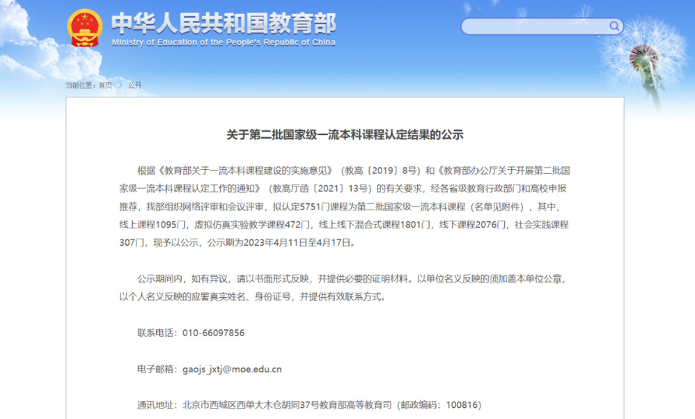 近日,根据《教育部关于一流本科课程建设的实施意见》(教高〔2019〕8号)和《教育部办公厅关于开展第二批国家级一流本科课程认定工作的通知》(教高厅函〔2021〕13号)的有关要求,经各省级教育行政部门和高校申报推荐,教育部组织网络评审和会议评审,拟认定5751门课程为第二批国家级一流本科课程,其中线下课程2076门。