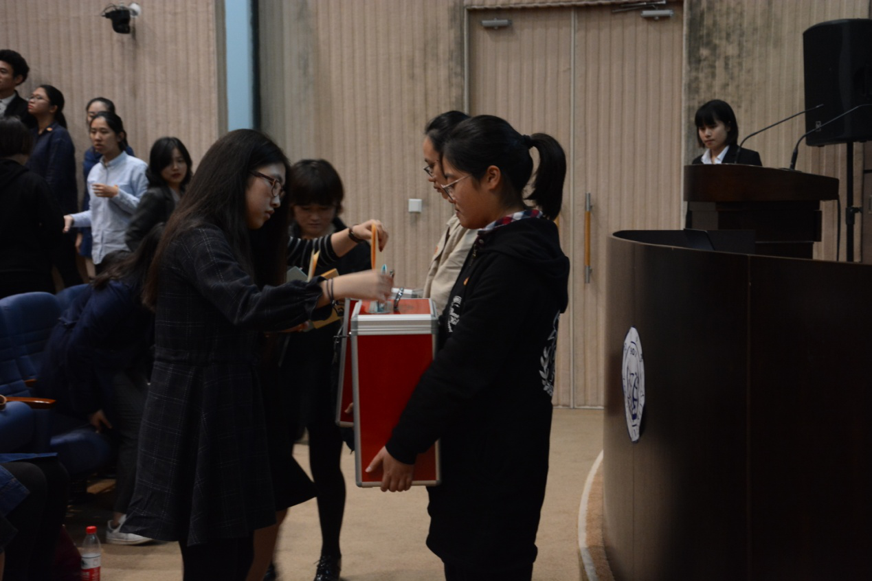 会议的第七项议程,6位候选人按姓氏笔画为序,依次进行了竞选演讲。各位代表在认真聆听演讲后,进行了审慎的无记名投票。经过监票、计票小组紧张的统计,大会差额选举产生了yl6809永利集团第二届学生会主席团和yl6809永利官网集团第四十届学生委员会中期会议委员候选人。方沁文(女)得赞成票65票、王恬潇(女)得赞成票48票、朱文得赞成票63票、贺琦(女)得赞成票38票、夏怡弯(女)得赞成票66票、曹佳鲁得赞成票73票。根据本次大会《选举办法》有关规定,方沁文(女)、朱文、夏怡弯(女)、曹佳鲁当选为院学生会主席团成员,曹佳鲁同学当选为校第四十届学生委员会中期会议委员候选人。
