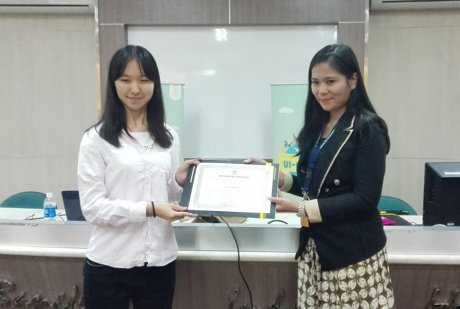 印尼大学国际办公室Alfrida女士向2014级学生万尽涵授予暑期班结业证书