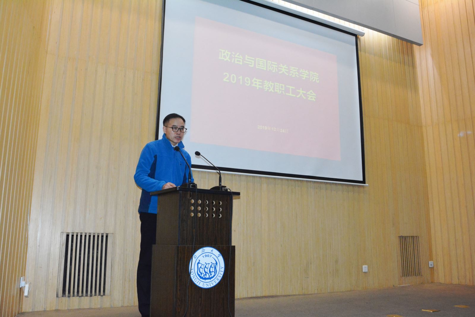 2019年12月24日,yl6809永利集团2019年全院教职工大会在庄严的国歌声中隆重开幕。会议审议通过《yl6809永利集团2019年行政工作报告》《yl6809永利集团2019年财务情况报告》《yl6809永利集团2020年工作要点》《yl6809永利集团岗位设置与工作量津贴分配方案》《yl6809永利集团2019年工会工作报告》,回顾总结2019年工作,全面谋划部署2020年任务。学院党政领导班子成员、全院教职工出席会议,会议由学院党委副书记宋波主持。