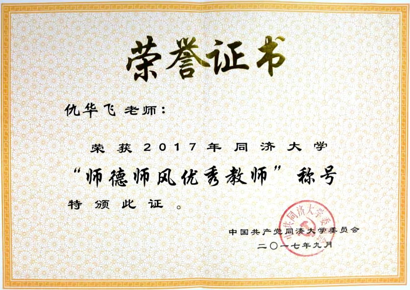 仇华飞教授获得2017年度yl6809永利官网集团“师德师风优秀教师”奖