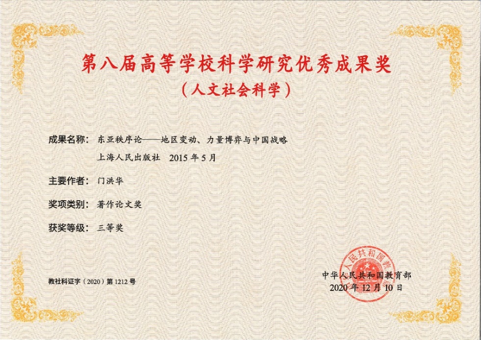 In February 2022, the results of the 16th Shanghai “Silver Pigeon Award” of 2021, organized by the International Communication Office of the CPC Shanghai Municipal Committee, were announced. Professor Men Honghua’s book Order of East Asia: Regional Transformation, Competition among Main Powers, and China’s Strategy (Shanghai People's Publishing House, 2015), sent by Shanghai People's Publishing House, 2015), is honored the “Silver Pigeon Award” of 2021.