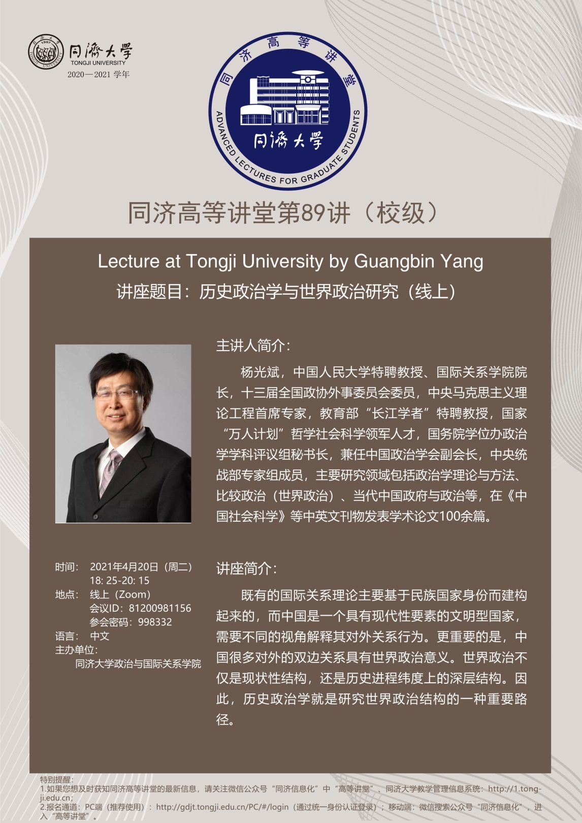 The 89th lecture of “Tongji Advanced Lectures for Graduate Students” was successfully held by the Institute for China & World Studies and the School of Political Science & International Relations, Tongji University on the evening of April 20, 2021 via Zoom. Professor Yang Guangbin from the School of International Studies, Renmin University of China was specially invited to deliver a keynote speech themed “Historical Political Science and World Politics Studies”. Professor Men Honghua, President of the Institute for China & World Studies and Dean of the School of Political Science & International Relations, Tongji University, moderated the lecture. Professor Song Wei, Director of the Department of International Politics, the School of International Studies, Renmin University of China, attended the lecture as a guest. Nearly 300 teachers and students from inside and outside Tongji University watched the academic lecture online.