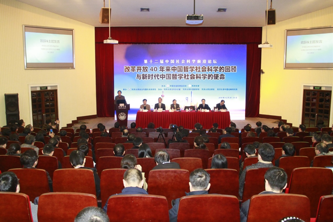 Co-hosted by Social Sciences in China Press (SSCP) and Tongji University, organized by the School of Political Science & International Relations (SPSIR) and the Institute for China & World Studies of Tongji University, and supported by the Liberal Arts Office, the School of Foreign Languages, and the Law School of Tongji University, the 12th China Social Sciences Frontier Forum was held in Tongji University on December 29, 2018. More than 100 experts and leaders from nearly 50 universities including the Chinese Academy of Social Sciences (CASS), Tsinghua University, Renmin University of China (RUC), Wuhan University, Nanjing University, Jilin University, Tongji University, Shanghai Jiao Tong University (SJTU), and nearly 20 local academies and associations of social sciences gathered in the lecture hall on the first floor of Yifu Building to discuss major issues of long concern by the Chinese community of philosophy and social sciences in the past 40 years of reform and opening up, around the theme of “Review of Chinese Philosophy and Social Sciences in the Past 40 Years of Reform and Opening Up and the Mission of Chinese Philosophy and Social Sciences in the New Era”. Professor Fang Shouen, Secretary of the Party Committee of Tongji University, researcher Zhang Jiang, Editor-in-Chief of SSCP, Shi Jun, Deputy Resident Director of the Economic Committee of the 12th National Committee of the CPPCC, and Professor Zhou Hanmin, Vice Chairman of the Shanghai Municipal Committee of the CPPCC, attended the opening ceremony and delivered speeches. The opening ceremony was moderated by Wang Limin, Executive Deputy Editor-in-Chief of SSCP.